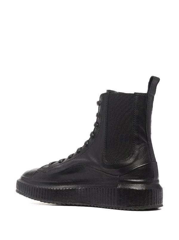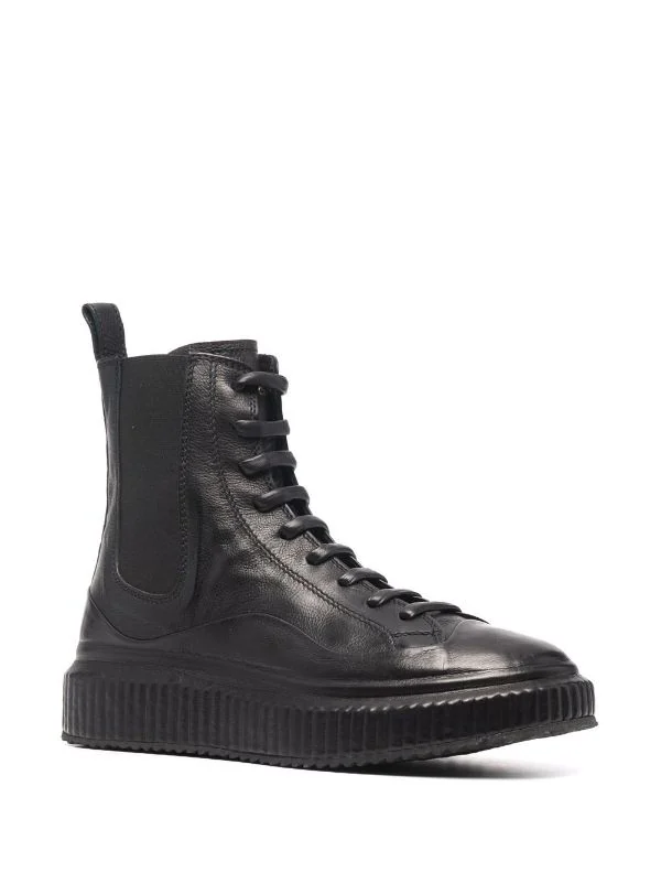 Empiècements élastiqués sur les côtés, fermeture à lacer sur le devant, languette d’enfilage au talon, semelle crantée en caoutchouc, bout rond. Couleur : noir. Matière : cuir de veau.