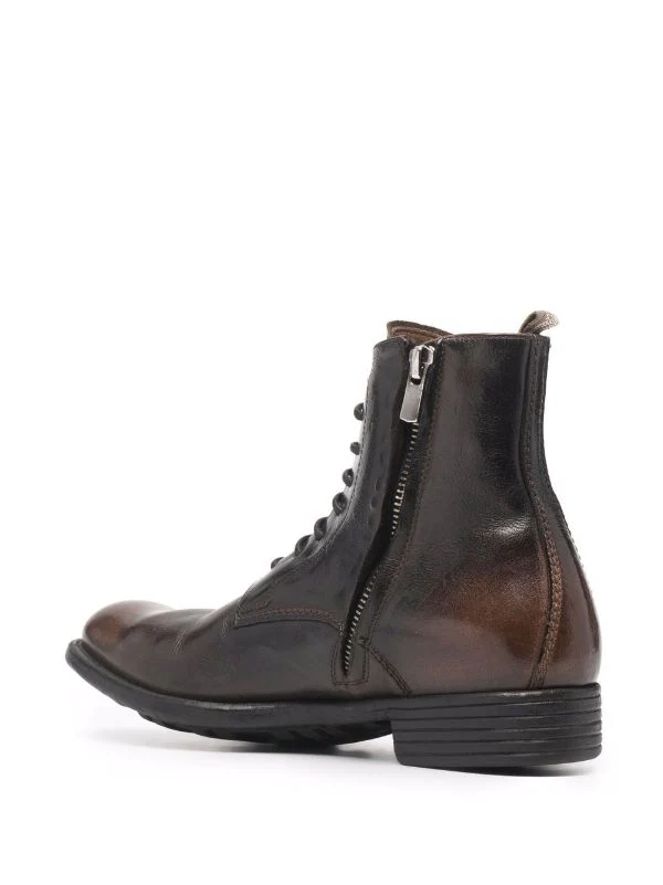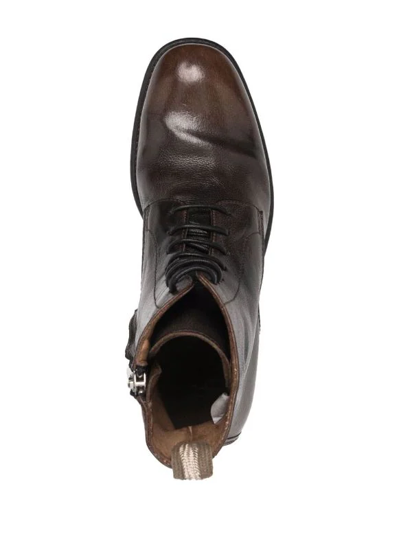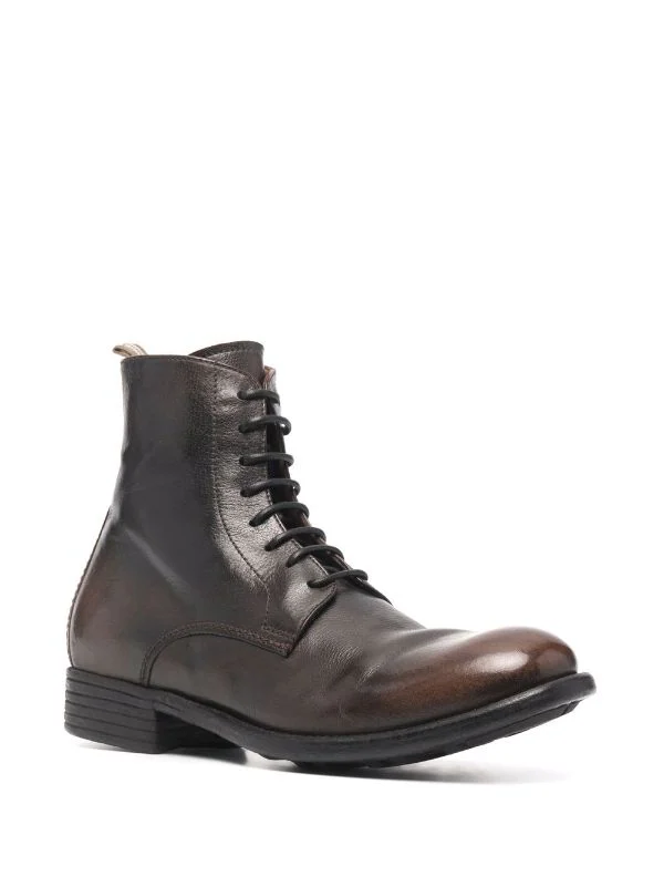 Effet délavé, bout rond, fermeture à lacer sur le devant, hauteur cheville, languette d’enfilage au talon, semelle plate en caoutchouc, petit talon épais. Matière : cuir.