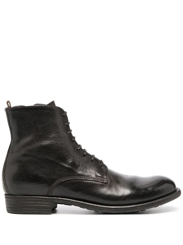 Bout rond, fermeture à lacer sur le devant, languette d’enfilage au talon, semelle plate, longueur cheville. Couleur : marron.