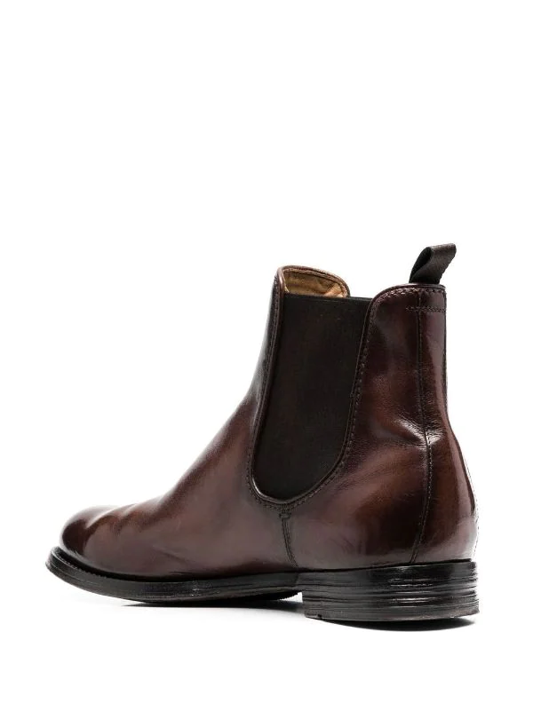Café, cuir, design à enfiler, bout en amande, empiècements élastiqués sur les côtés, languette d’enfilage au talon, semelle intérieure griffée, semelle plate en caoutchouc, hauteur cheville.