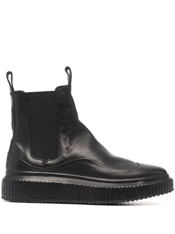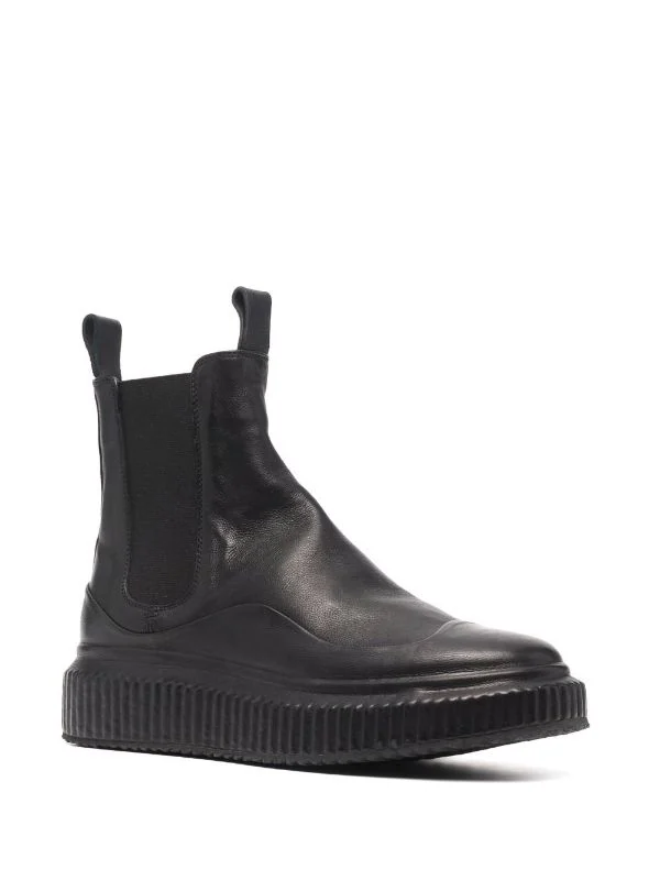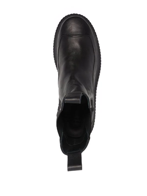 Bout rond, empiècements élastiqués sur les côtés, hauteur cheville, ouverture à double languette, semelle plate en caoutchouc. Couleur : noir. Matière : cuir.