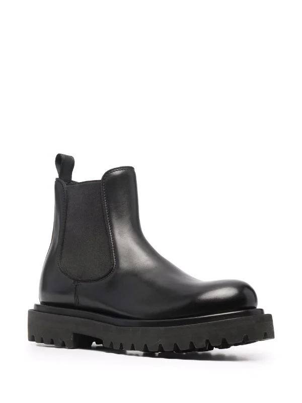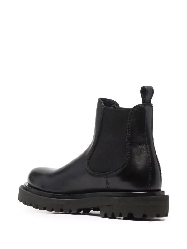 Fini poli, empiècements élastiqués sur les côtés, bout rond, languette d’enfilage au talon, semelle crantée en caoutchouc. Couleur : noir. Matière : cuir de veau.