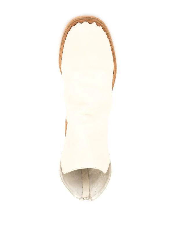 Coutures ton sur ton, bout en amande, fermeture zippée à l’arrière, hauteur cheville, semelle intérieure à logo, petit talon épais. Matière : cuir de veau.