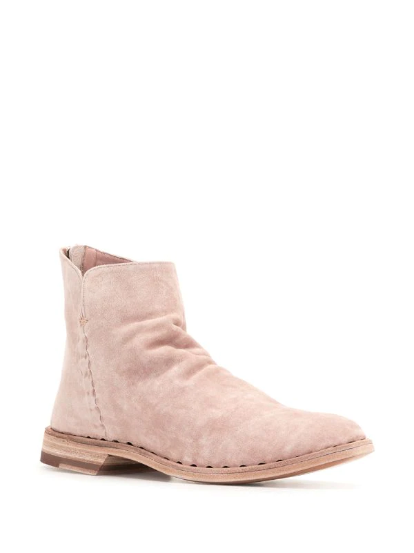 Coutures ton sur ton, bout en amande, fermeture zippée à l’arrière, hauteur cheville, semelle intérieure à logo, petit talon. Matière : cuir de veau.