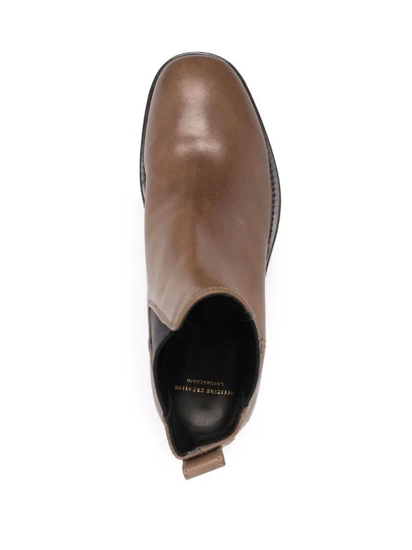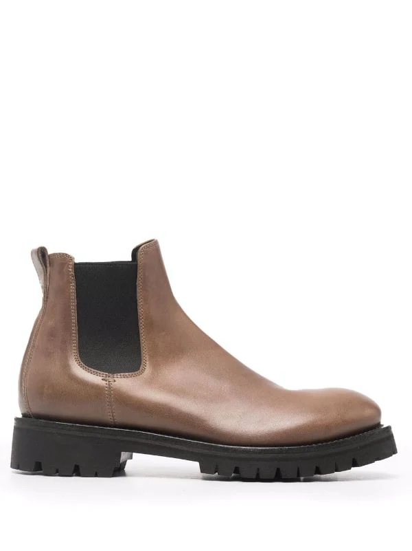 Bout rond, empiècements élastiqués sur les côtés, hauteur cheville, languette d’enfilage au talon, semelle crantée en caoutchouc. Matière : cuir.