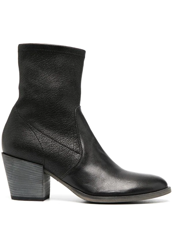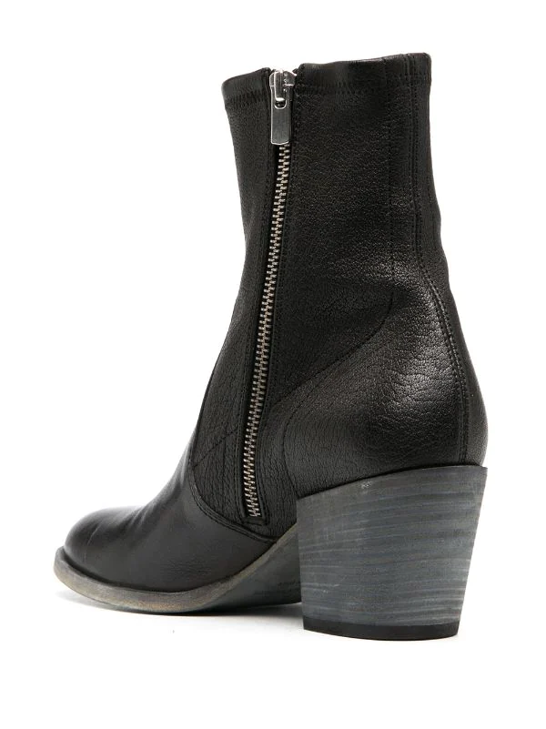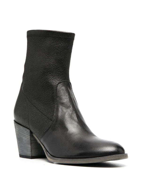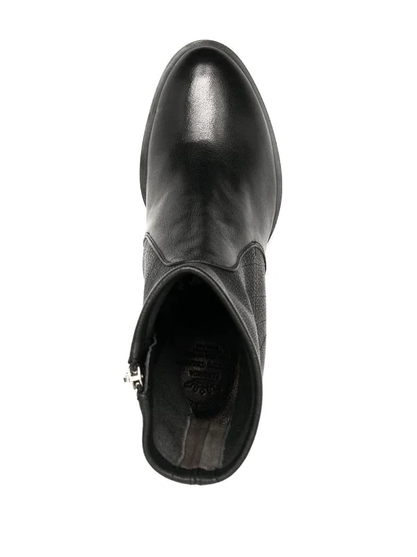 Bout rond, fermeture zippée sur le côté, petit talon bottier. Couleur : noir. Matière : cuir.