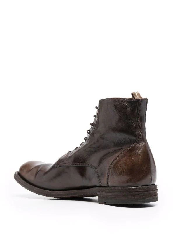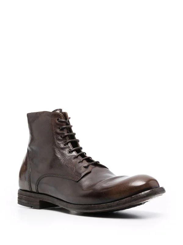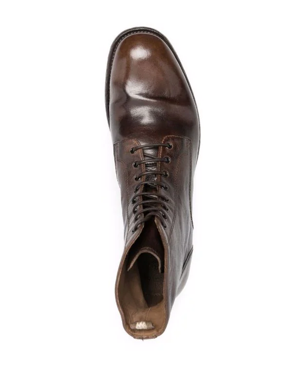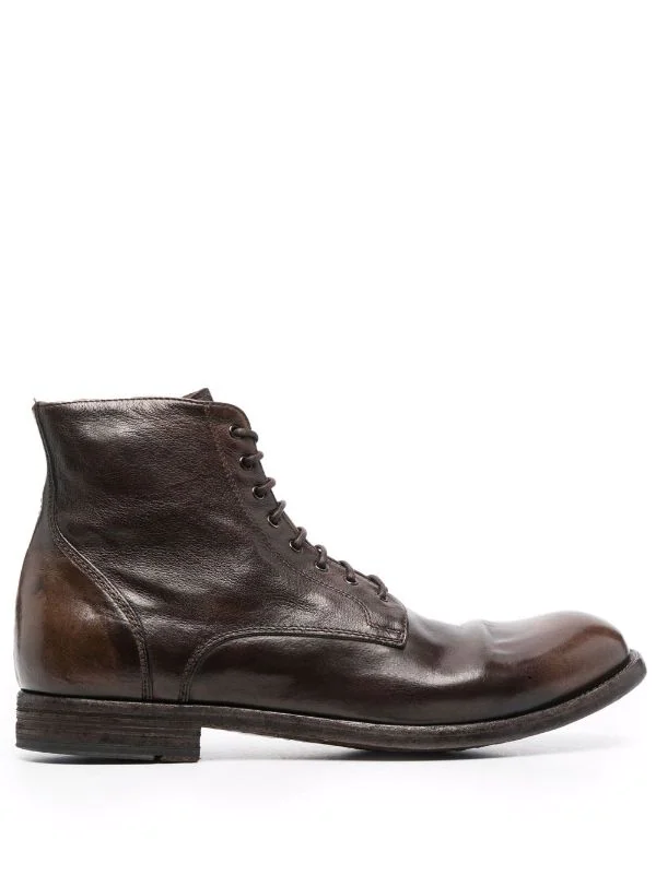 Hauteur cheville, bout rond, fermeture à lacer sur le devant, semelle plate en cuir. Couleur : marron. Matière : cuir.