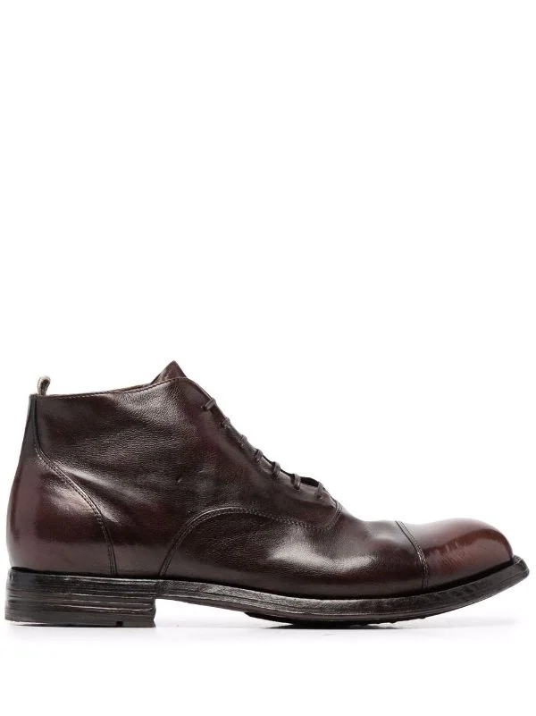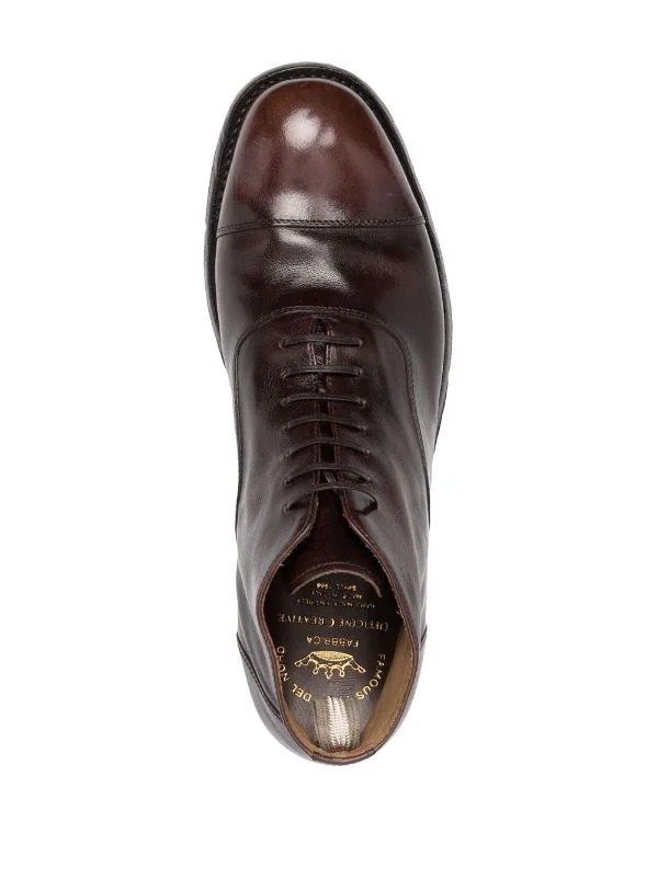 Fini poli, fermeture à lacer sur le devant, semelle plate en caoutchouc, languette d’enfilage au talon, bout rond. Couleur : marron. Matière : cuir.