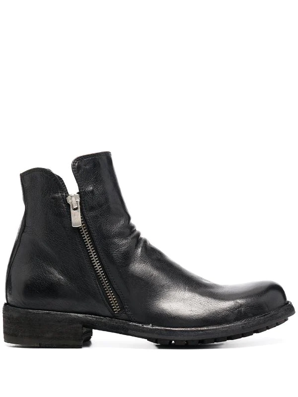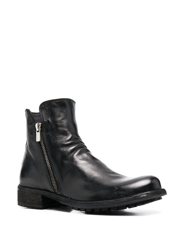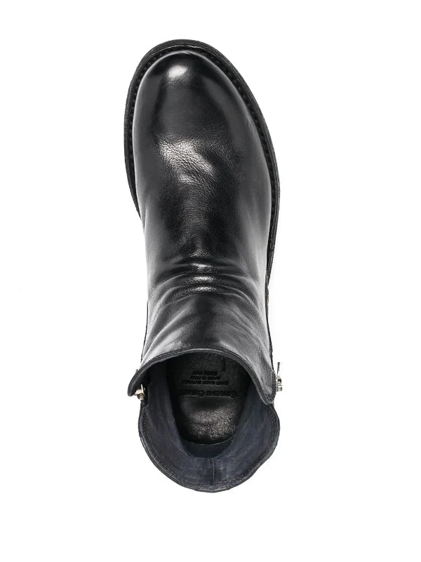Bout rond, fermeture zippée sur le côté, semelle plate, longueur cheville. Couleur : noir.