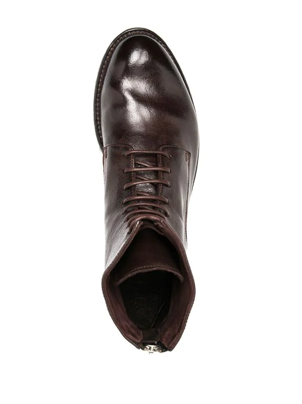 Bout en amande, fermeture à lacer sur le devant, fermeture zippée à l’arrière, petit talon bottier. Couleur : marron. Matière : cuir.