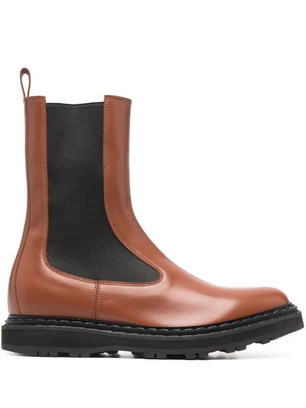 Bout rond, empiècements élastiqués sur les côtés, longueur midi, languette d’enfilage au talon, semelle crantée en caoutchouc. Matière : cuir.