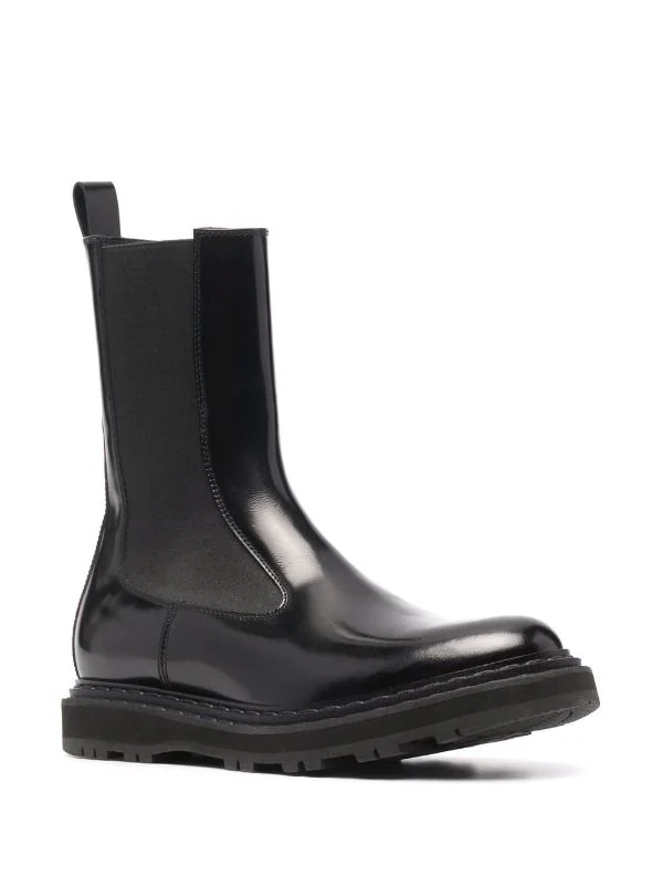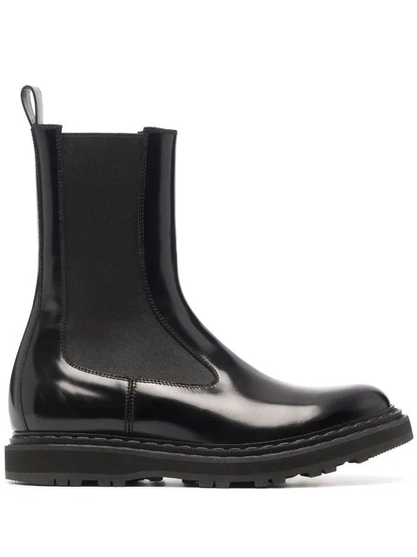 Fini brillant, hauteur cheville, design à enfiler, bout rond, empiècements élastiqués sur les côtés, languette d’enfilage au talon, semelle intérieure à logo, semelle crantée en caoutchouc. Couleur : noir. Matière : cuir de veau.