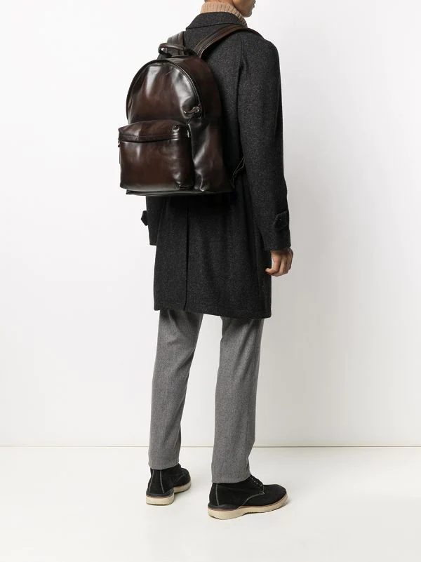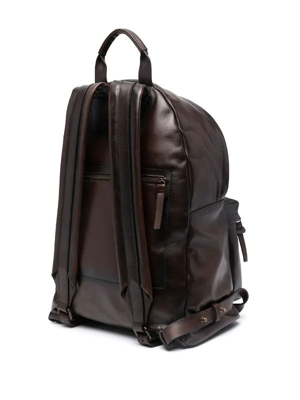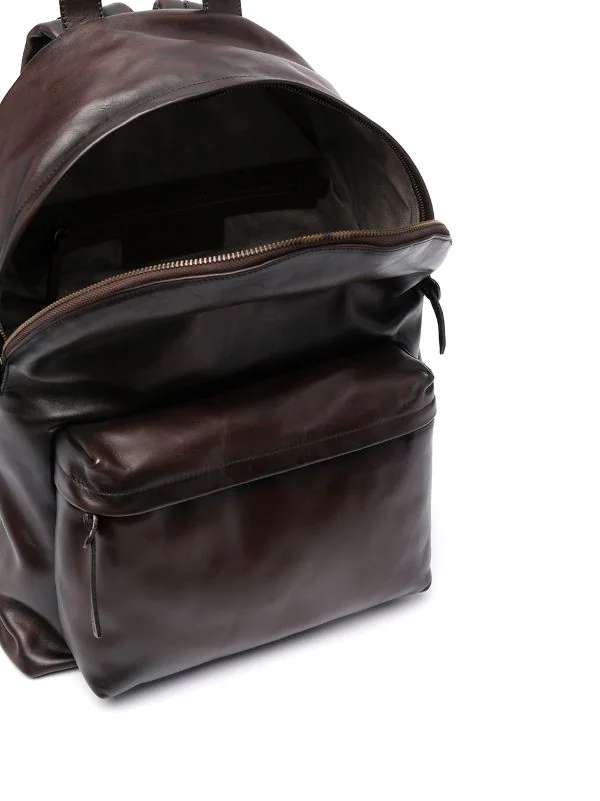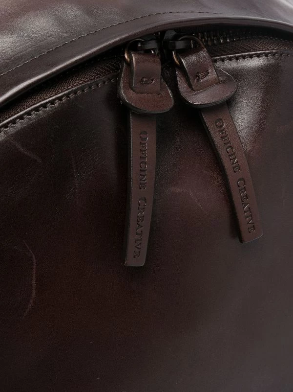 Doublure intégrale, compartiment principal, compartiment zippé sur le devant, poche arrière zippée, deux brides portées épaule ajustables, anse classique, fermeture zippée sur le dessus. Matière : cuir de buffle.