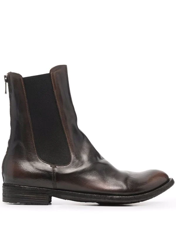Empiècements élastiqués sur les côtés, fermeture zippée à l’arrière, fini poli, bout rond, semelle en caoutchouc. Couleur : marron. Matière : cuir.