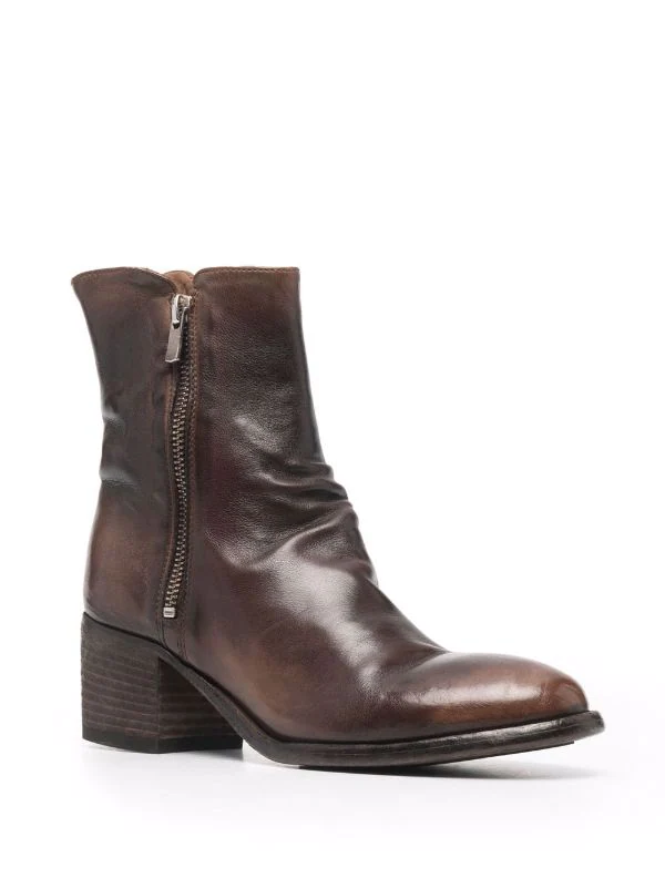 Fini poli, bout en amande, hauteur cheville, fermeture zippée sur le côté, petit talon épais. Matière : cuir.
