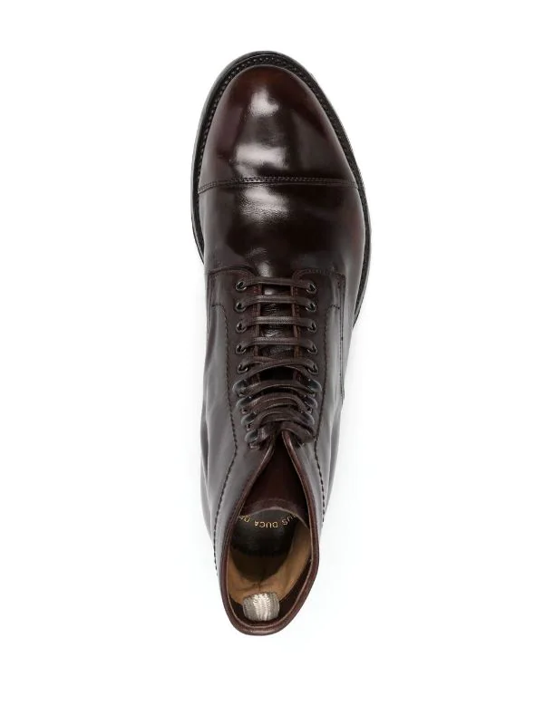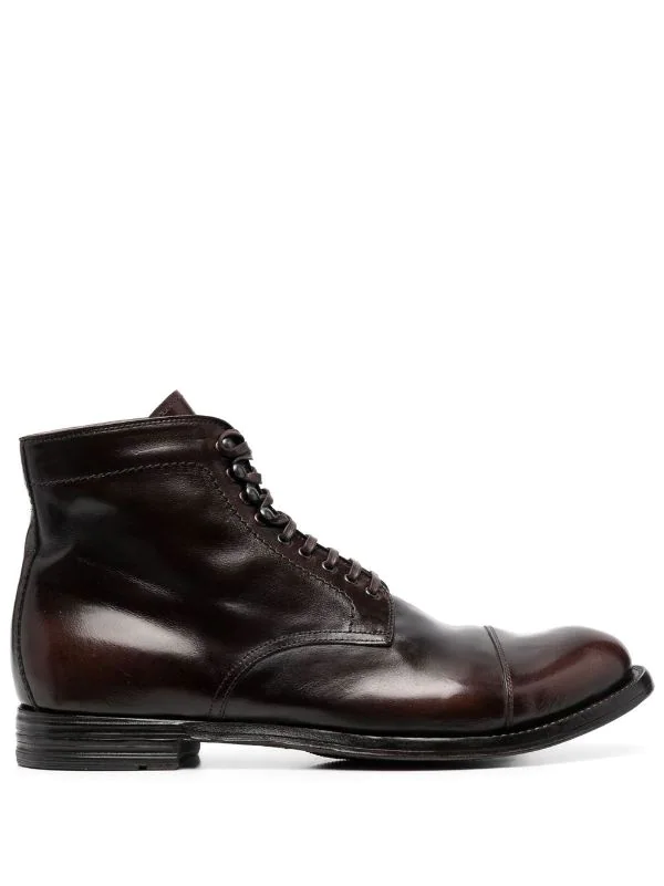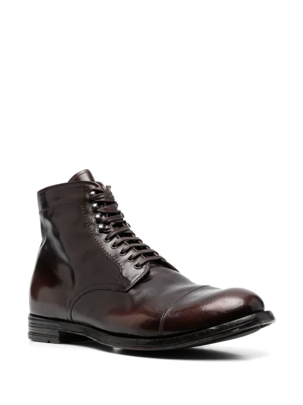 Marron, cuir, bout rond, fermeture à lacer sur le devant, semelle plate en caoutchouc, hauteur cheville.