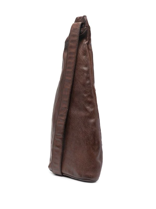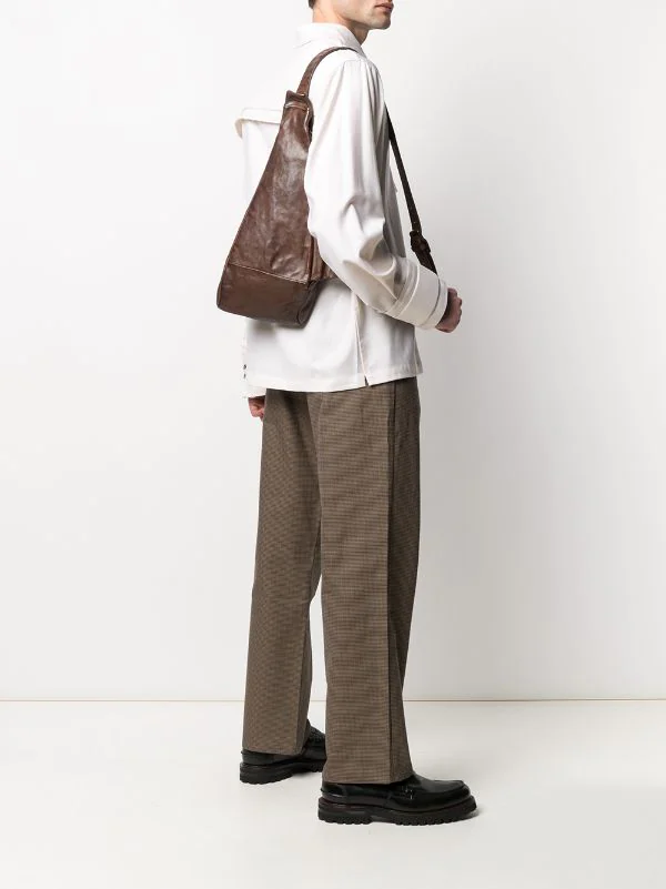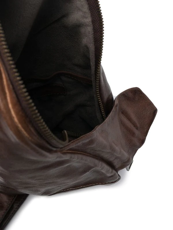 Design asymétrique à une épaule, bride portée épaule ajustable, fermeture zippée, compartiment principal, patch logo intérieur. Matière : cuir de buffle.