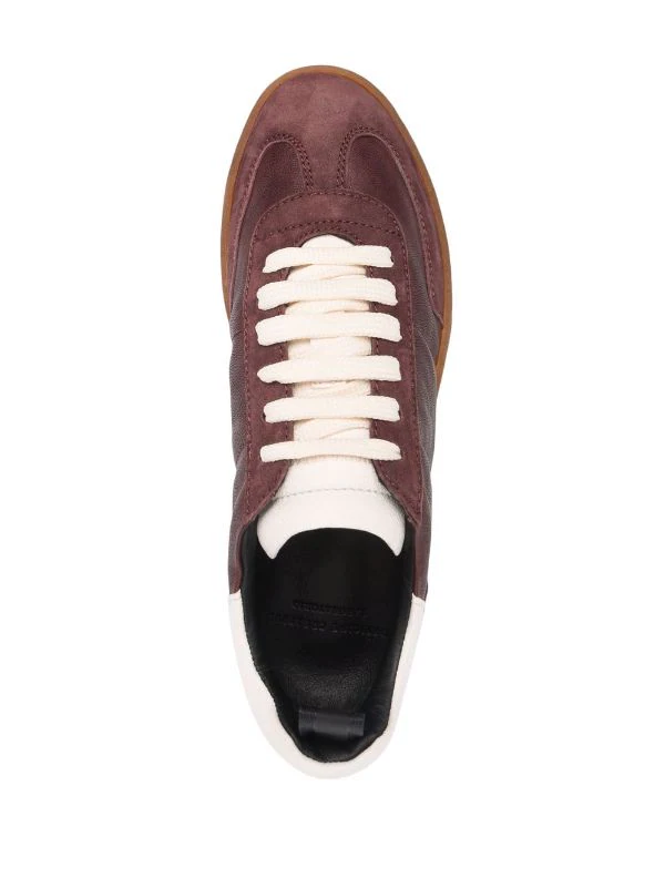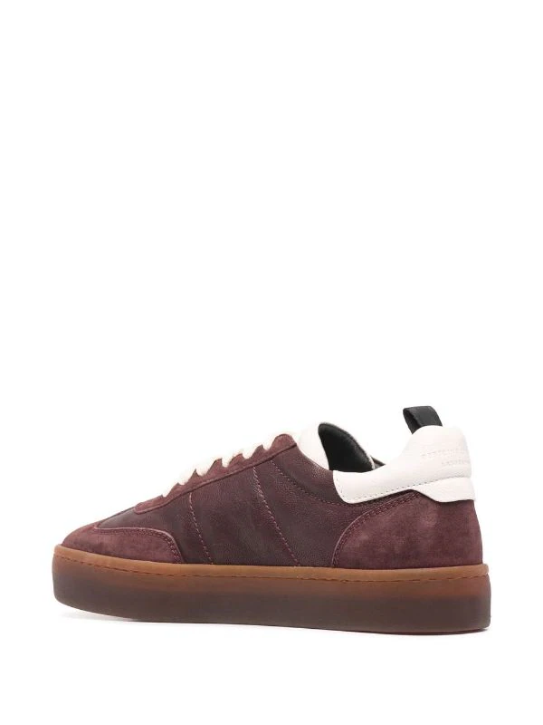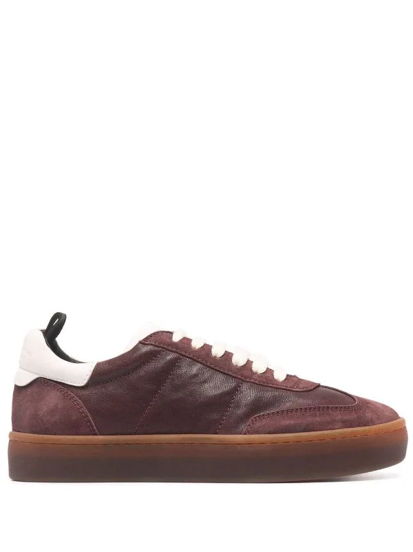 Design à empiècements, bout rond, fermeture à lacer sur le devant, languette à patch logo, contrefort à logo, languette d’enfilage au talon, semelle intérieure griffée, semelle plate en caoutchouc. Matière : cuir.