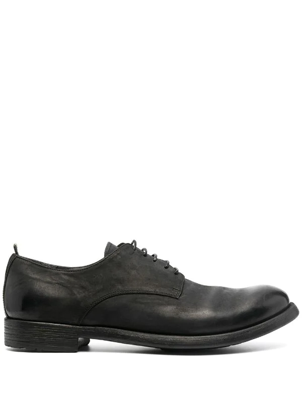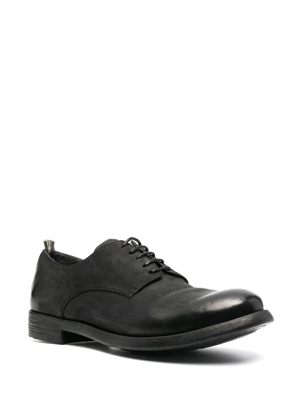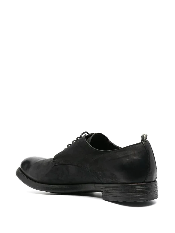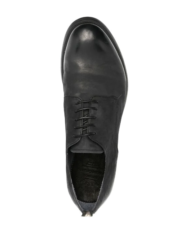 Bout en amande, fermeture à lacer sur le devant, languette d’enfilage au talon, petit talon épais, semelle plate en caoutchouc. Couleur : noir. Matière : cuir.