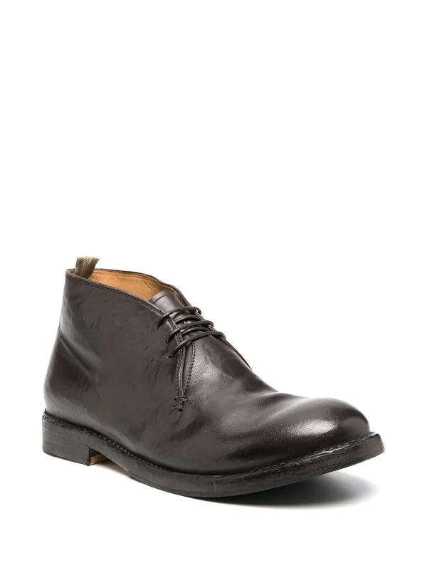 Effet brossé, bout rond, fermeture à lacer sur le devant, languette d’enfilage au talon, coutures ton sur ton, semelle plate. Matière : cuir de cheval.