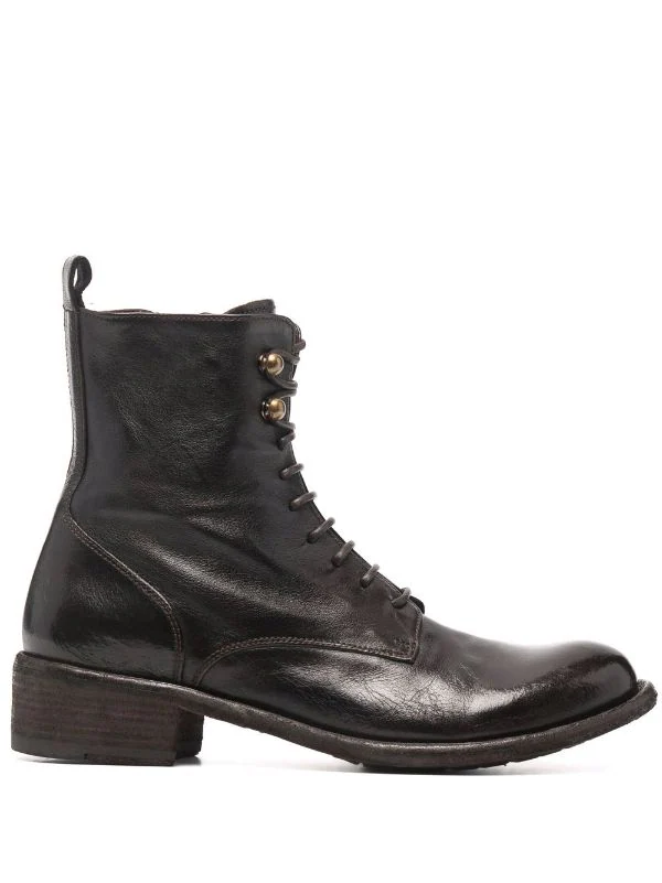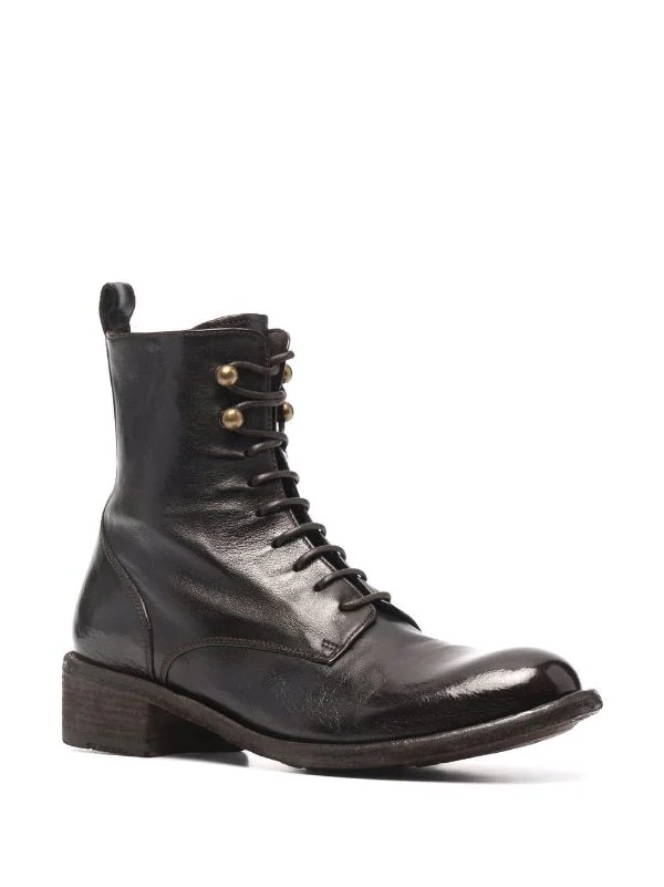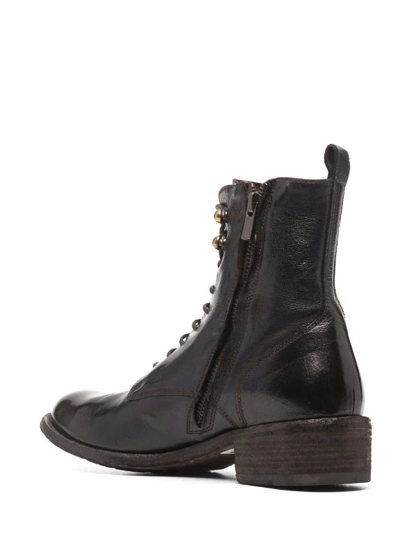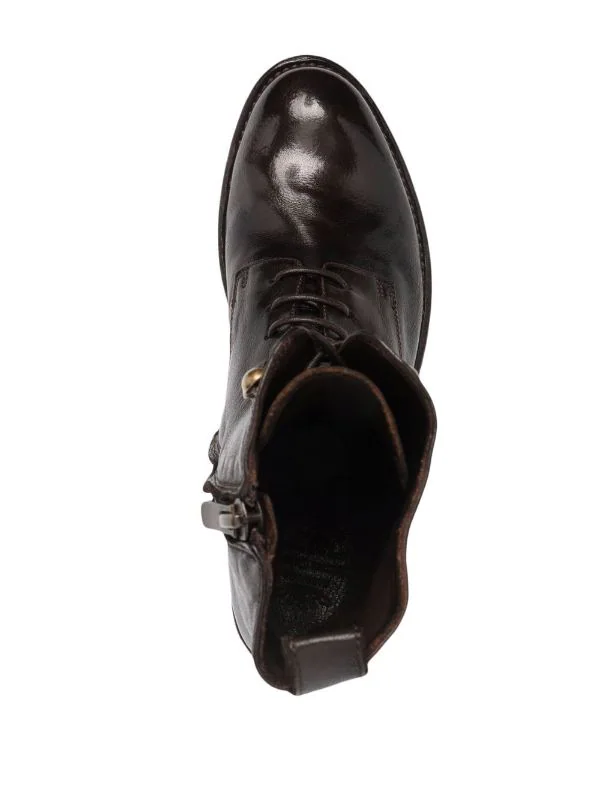 Fermeture à lacer sur le devant, fermeture zippée sur les côtés, languette d’enfilage au talon, petit talon bottier. Couleur : marron. Matière : cuir.