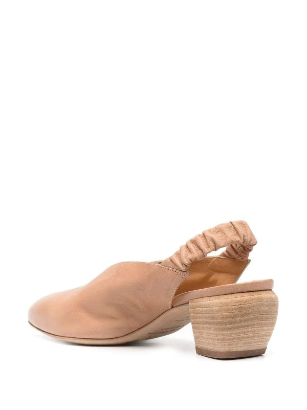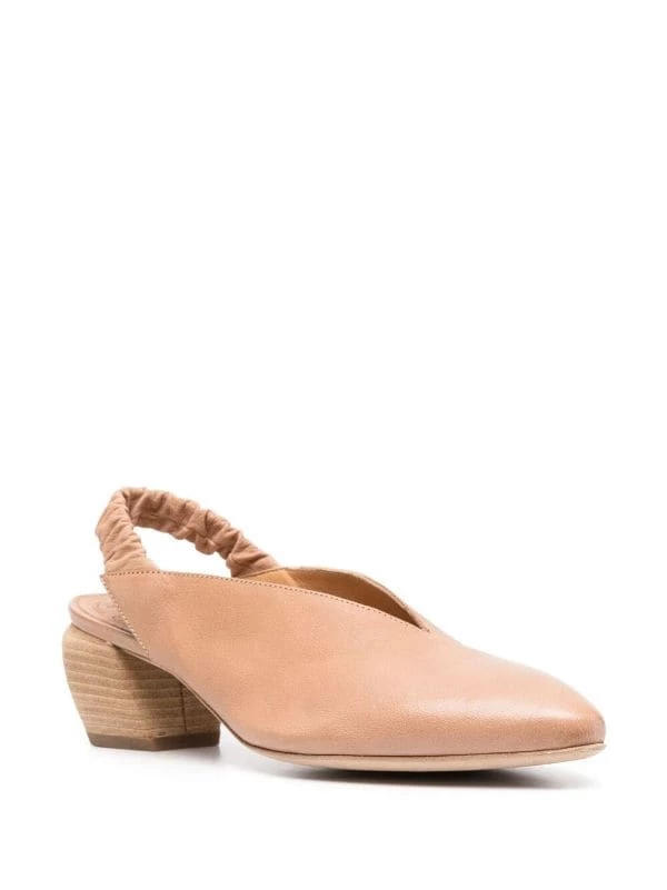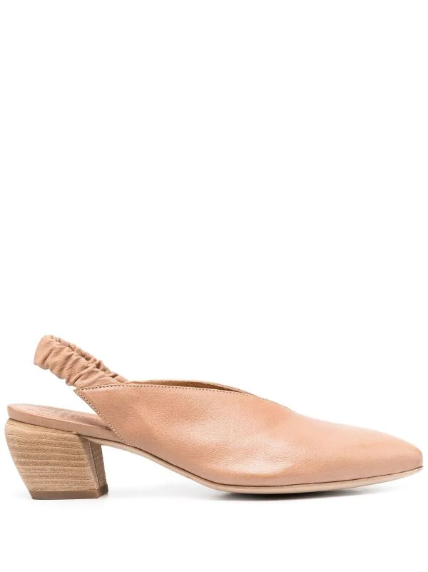 Bout pointu, semelle intérieure griffée, bride arrière, petit talon bottier. Matière : cuir.