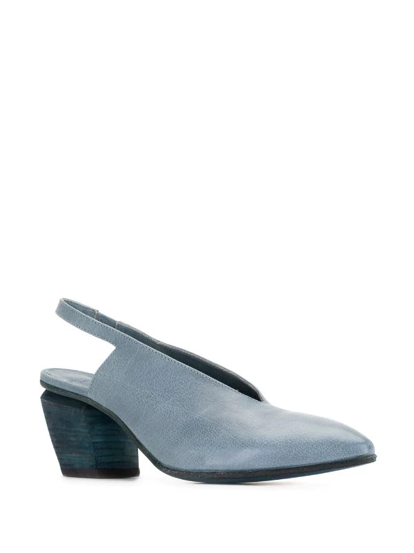 Bout pointu, bride arrière, semelle en cuir, talon mi-haut épais. Couleur : bleu. Matière : Cuir de Buffle.