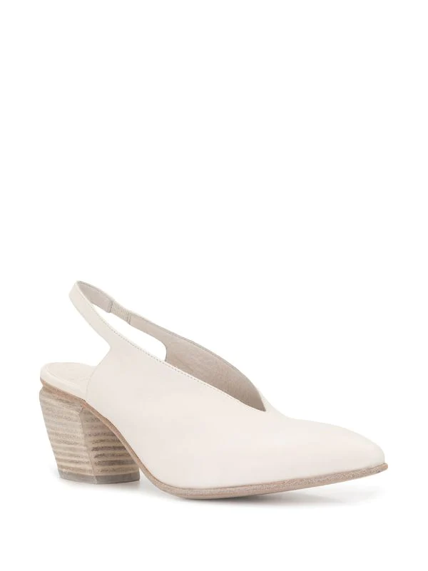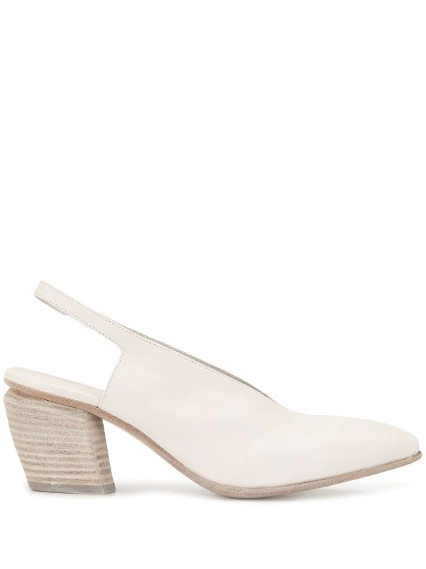 Bout pointu, bride arrière, doublure en cuir, talon mi-haut épais. Couleur : blanc. Matière : Cuir de Buffle.