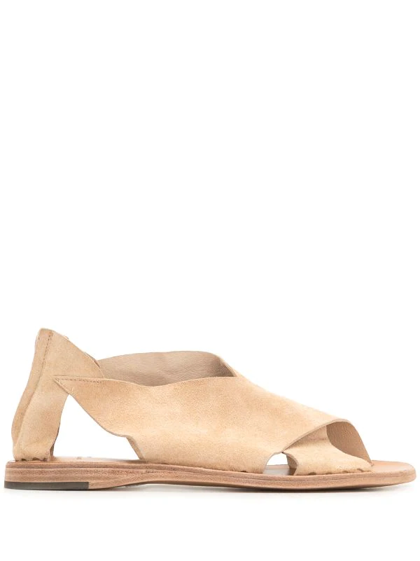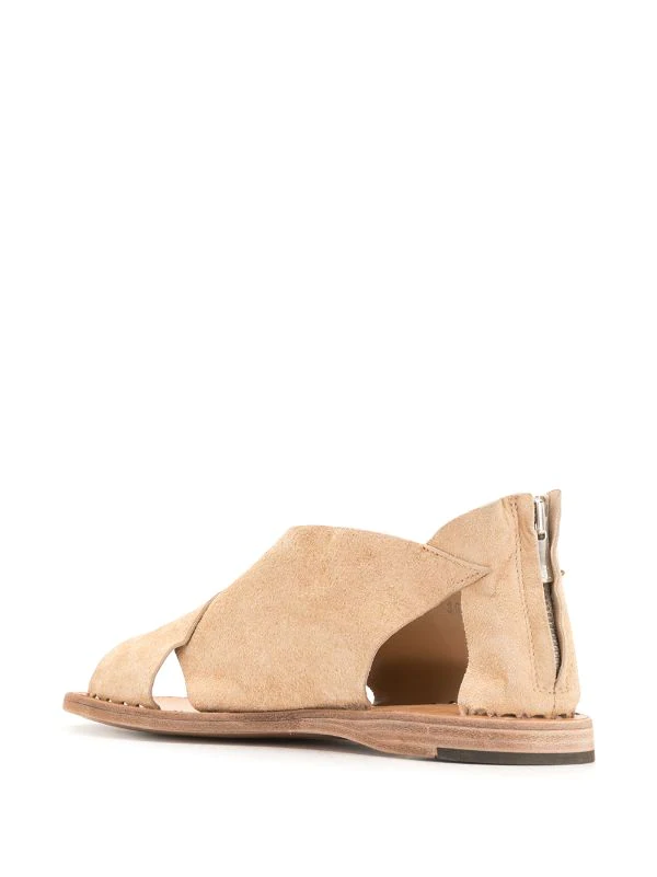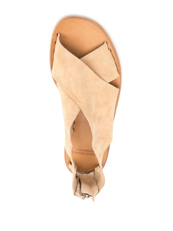 Détail de brides croisées, bout ouvert, fermeture zippée à l’arrière, semelle plate en cuir.