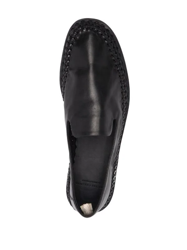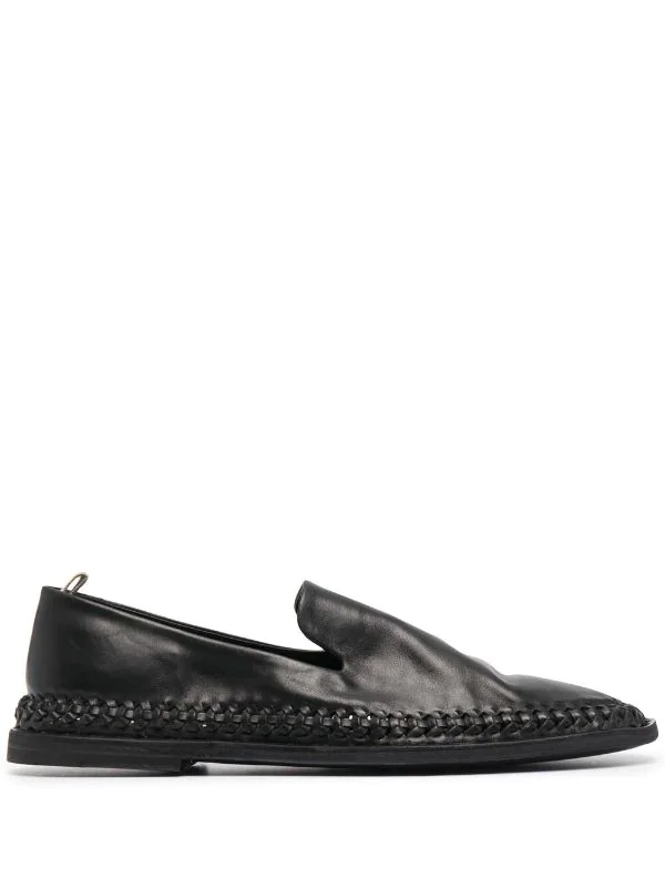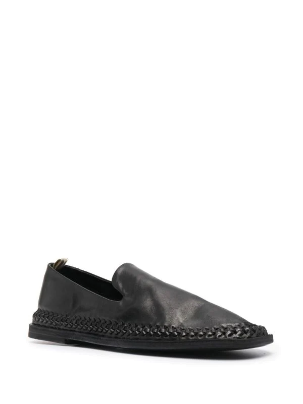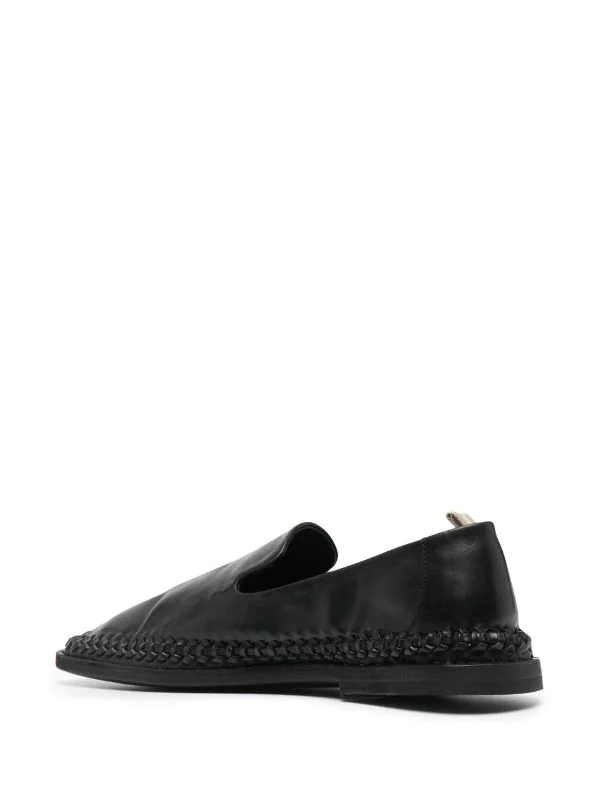 Détails de coutures roulées, bout rond, design à enfiler, semelle plate. Couleur : noir. Matière : cuir.