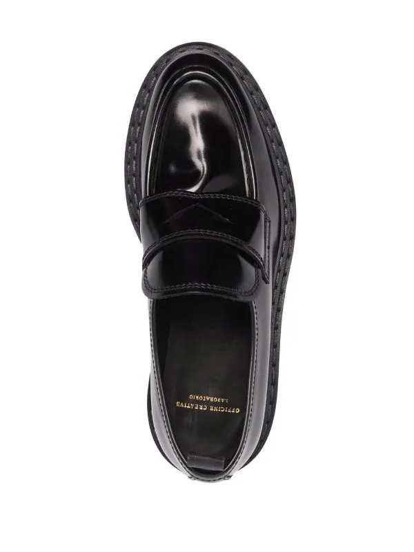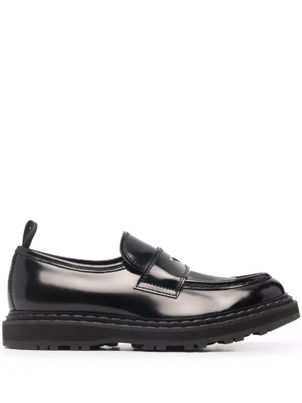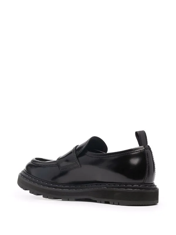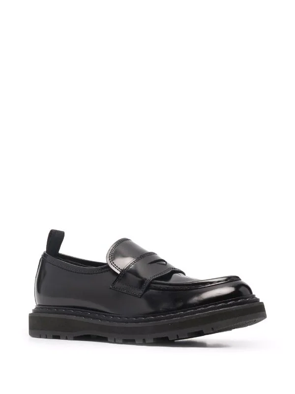 Fini brillant, design à enfiler, bout en amande, détails de brides, languette d’enfilage au talon, semelle intérieure griffée, semelle crantée en caoutchouc. Couleur : noir. Matière : cuir de veau.