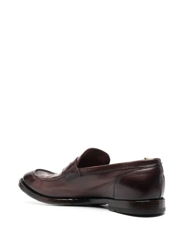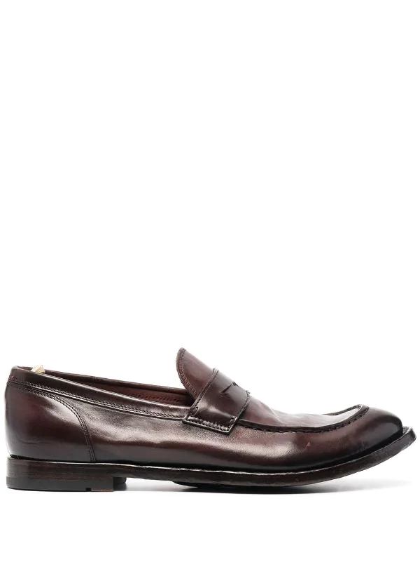 Effet délavé, entaille penny, bout en amande, semelle intérieure à logo, semelle plate, petit talon épais.