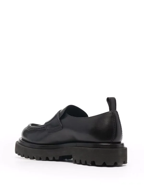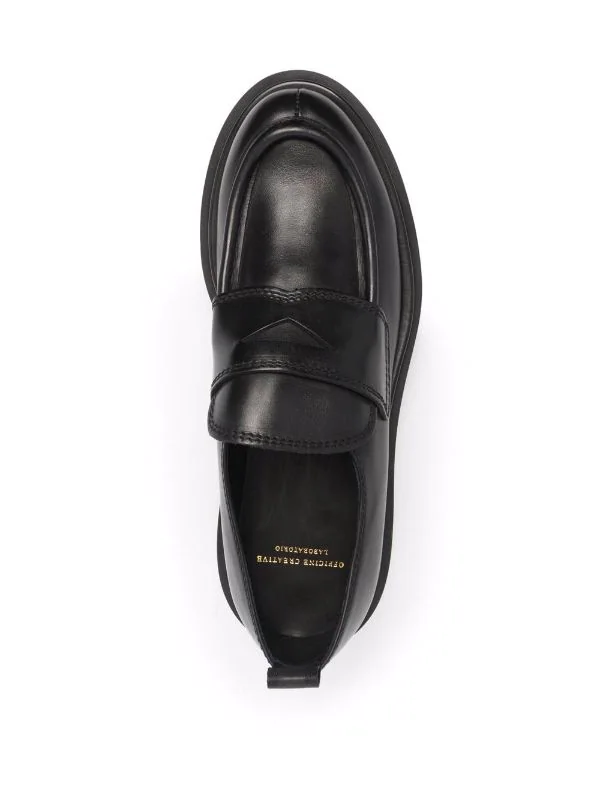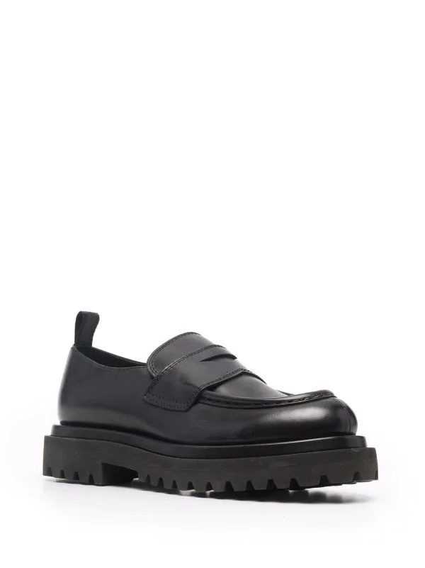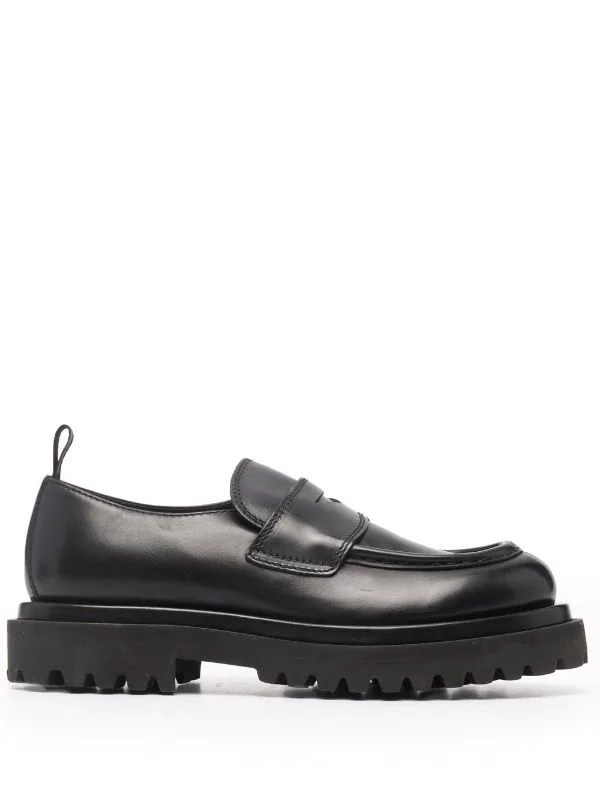 Fini poli, coutures ton sur ton, entaille penny, bout en amande, semelle intérieure griffée, design à enfiler, semelle en caoutchouc. Couleur : noir. Matière : cuir de veau.