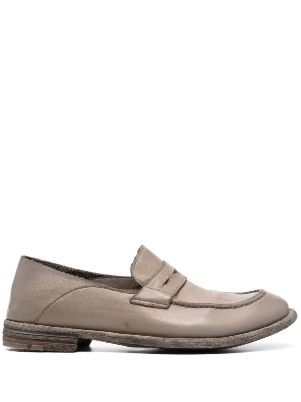 Texture grainée, effet usé, bout en amande, semelle intérieure griffée, design à enfiler, petit talon. Couleur : gris. Matière : cuir de buffle.