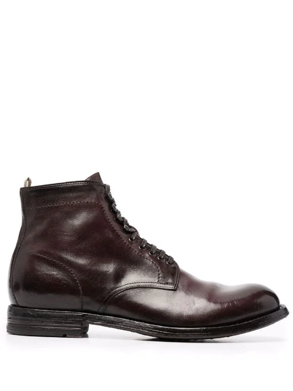 Fermeture à lacer sur le devant, semelle plate en caoutchouc, bout rond, fini poli. Couleur : marron. Matière : cuir.
