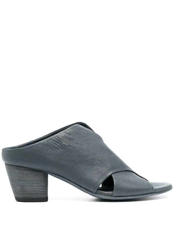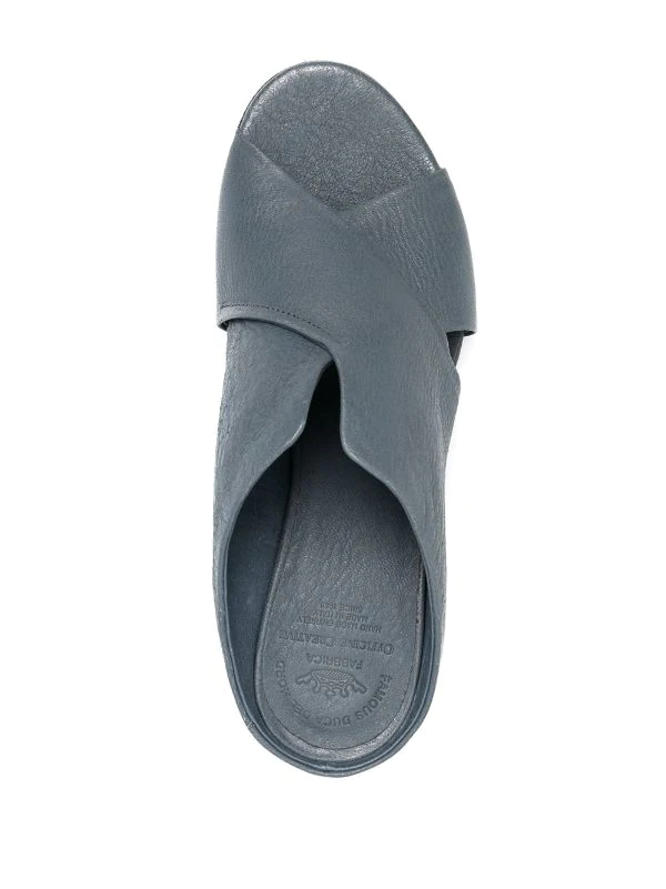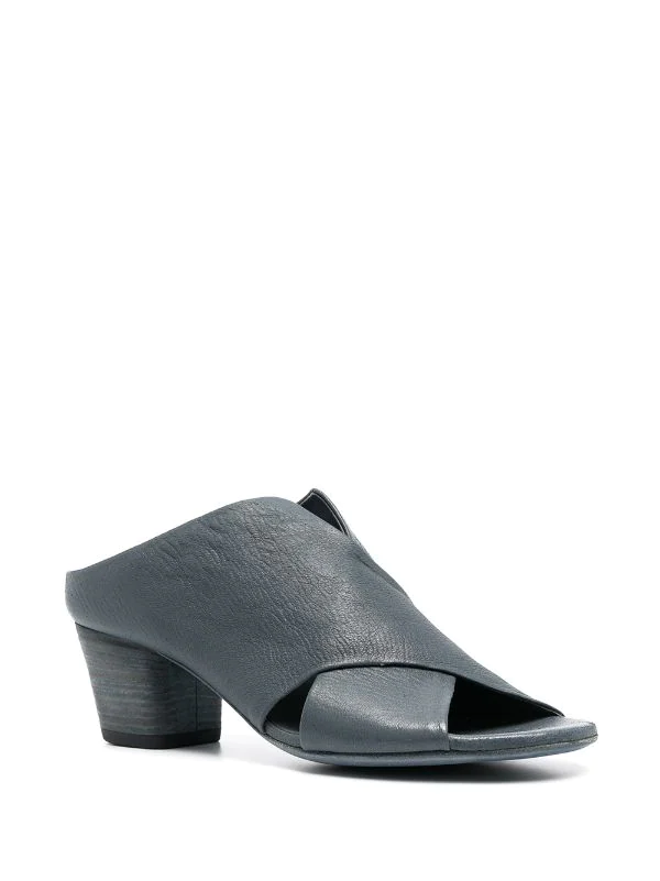 Petit talon épais, design à enfiler, détail de brides croisées, bout ouvert. Couleur : Bleu. Matière : cuir.