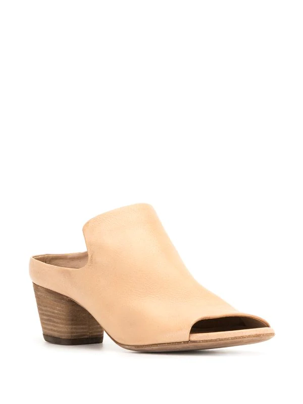 Bordures asymétriques, design à enfiler, bout ouvert, semelle intérieure à logo, talon bottier mi-haut. Matière : cuir.