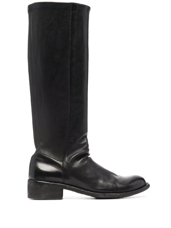 Longueur mollet, bout rond, fermeture zippée sur le côté, fini poli. Couleur : noir. Matière : cuir.
