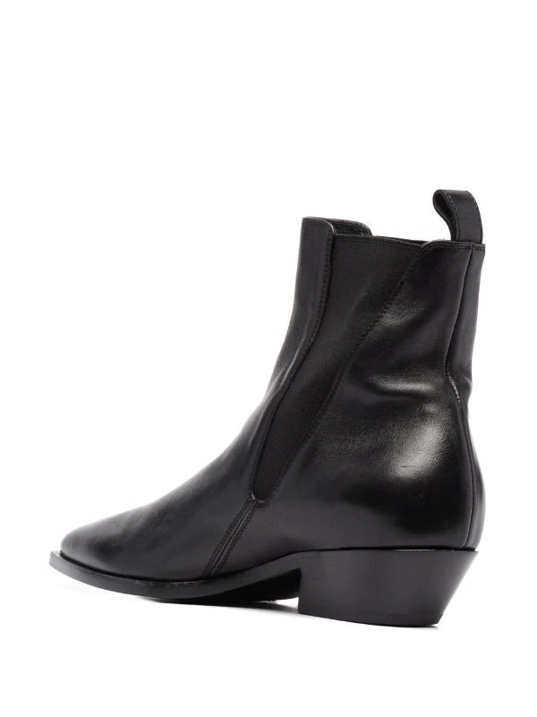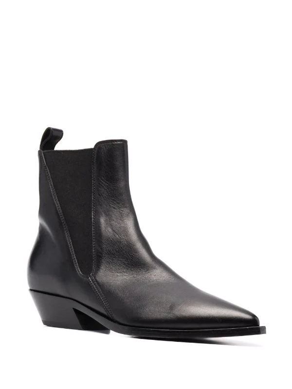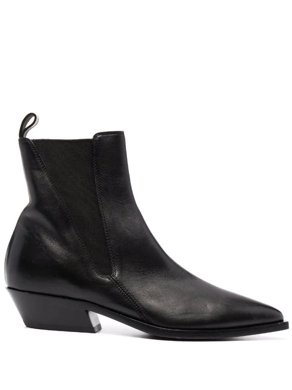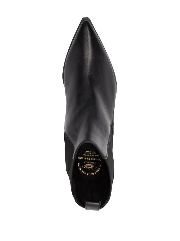 Bout pointu, empiècements élastiqués sur les côtés, design à enfiler, languette d’enfilage au talon, semelle intérieure griffée, petit talon. Couleur : noir. Matière : cuir.