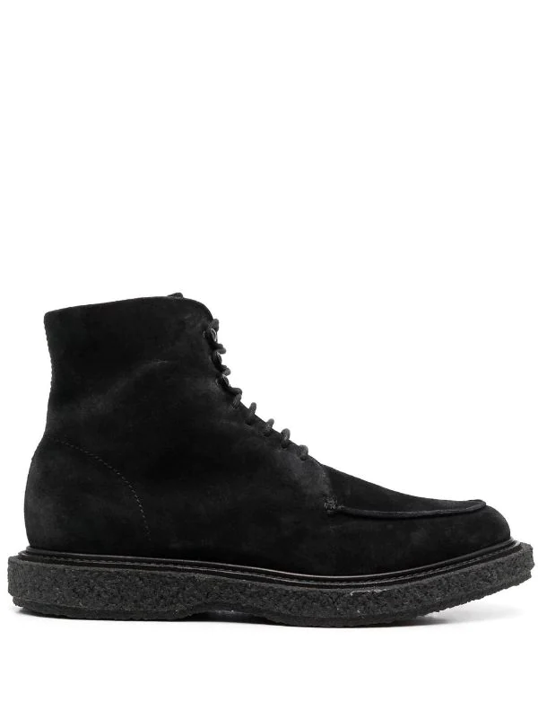 Noir, veau velours, fermeture à lacer sur le devant, semelle plate en caoutchouc.