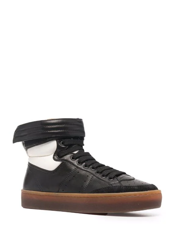 Design à empiècements, design matelassé, détails de perforations, fermeture scratch sur le devant, fermeture à lacer sur le devant, bout rond, semelle plate en caoutchouc. Matière : cuir.