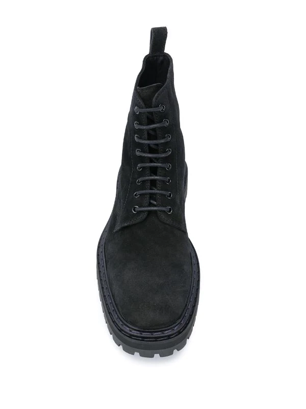 Bottines à lacets Officine Creative avec bout carré, fermeture à lacer sur le devant, languette arrière, petit talon épais et semelle crantée en caoutchouc. Couleur : noir.