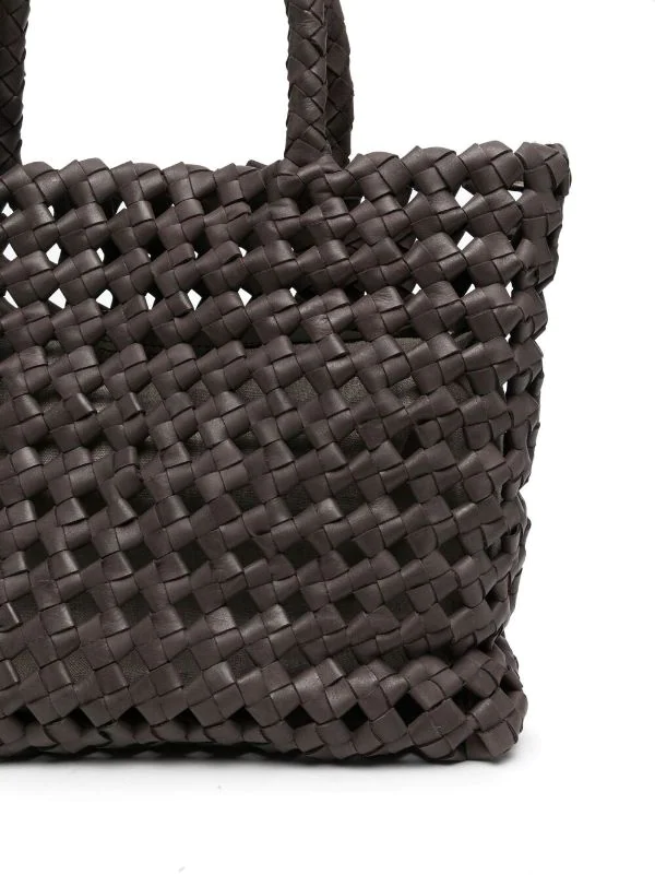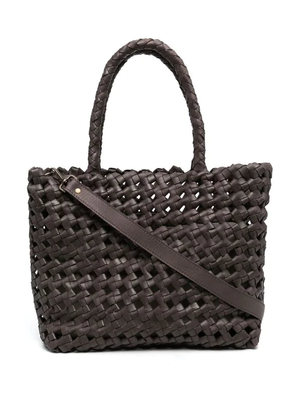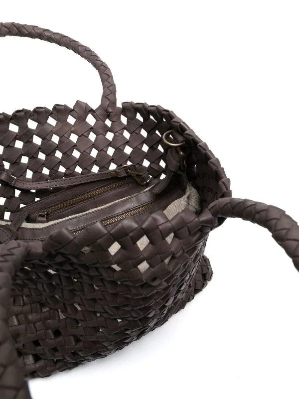 Design tissé, anses arrondies, fermeture zippée sur le dessus, bride porté épaule ajustable. Couleur : marron. Matière : cuir de veau.