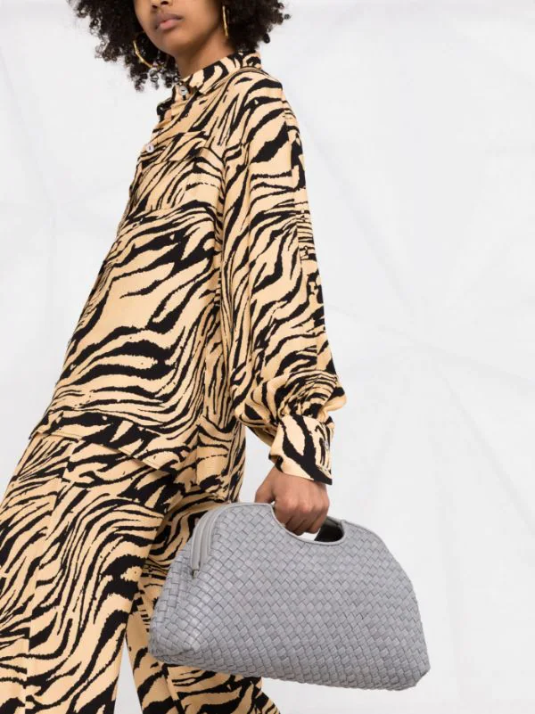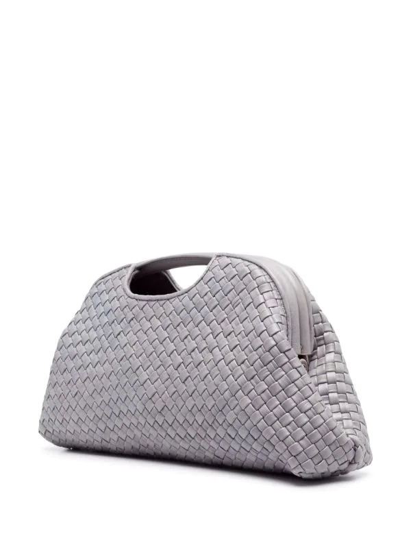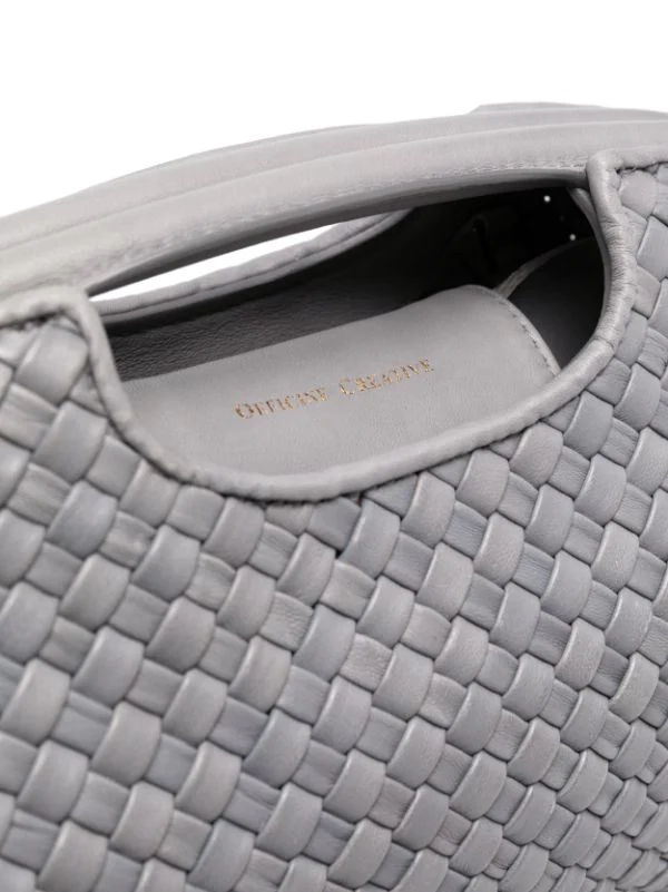 Design tissé, logo gravé, anses arrondies, bride porté épaule ajustable. Couleur : gris. Matière : cuir de veau.