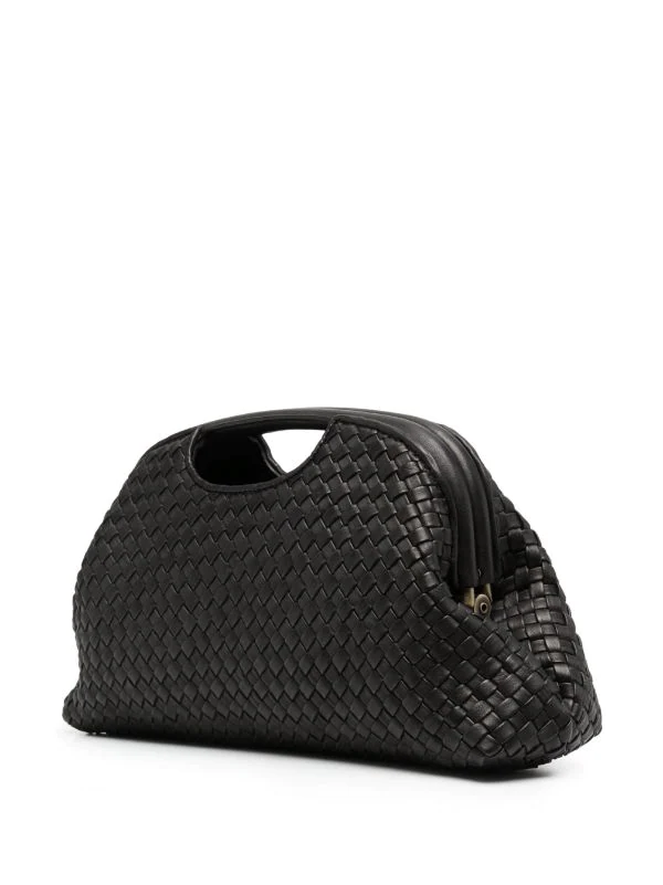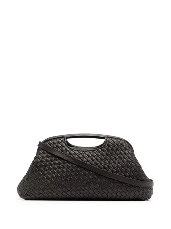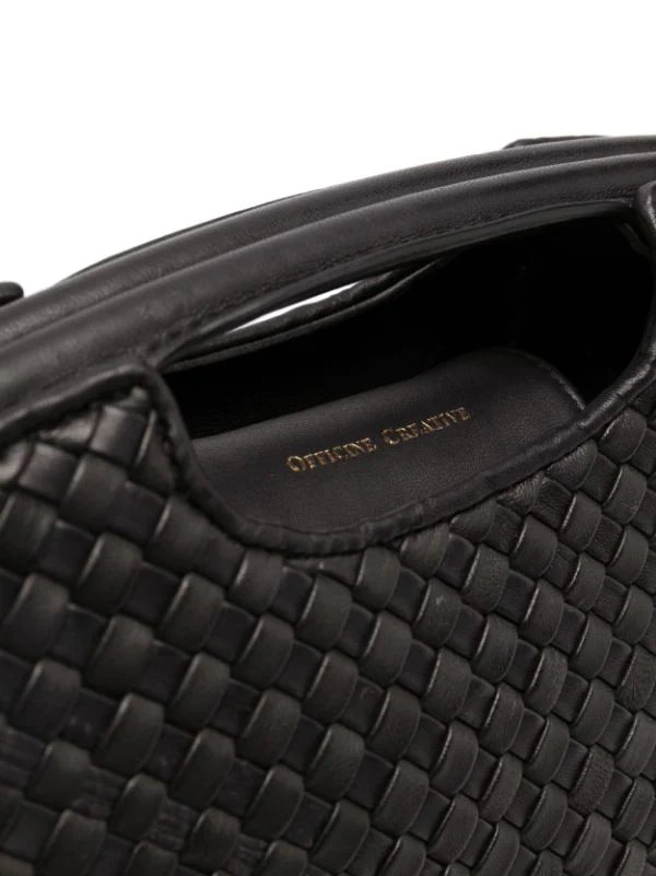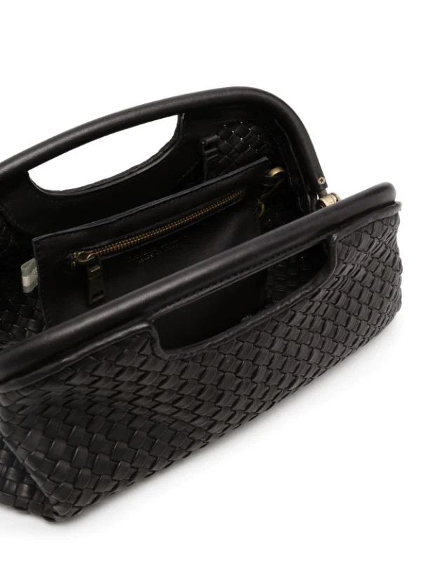 Design tissé, logo gravé, anses arrondies, bride porté épaule ajustable. Couleur : noir. Matière : cuir de veau.