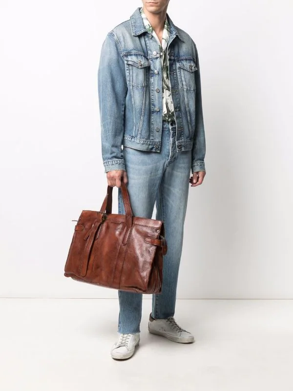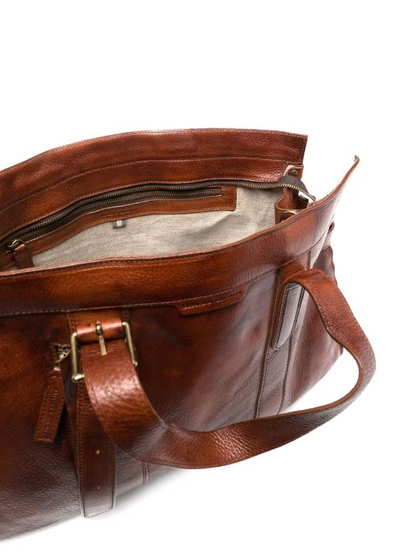 Finitions en métal doré, fermeture zippée sur le dessus, anses sur le dessus, poche intérieure. Matière : cuir de veau.