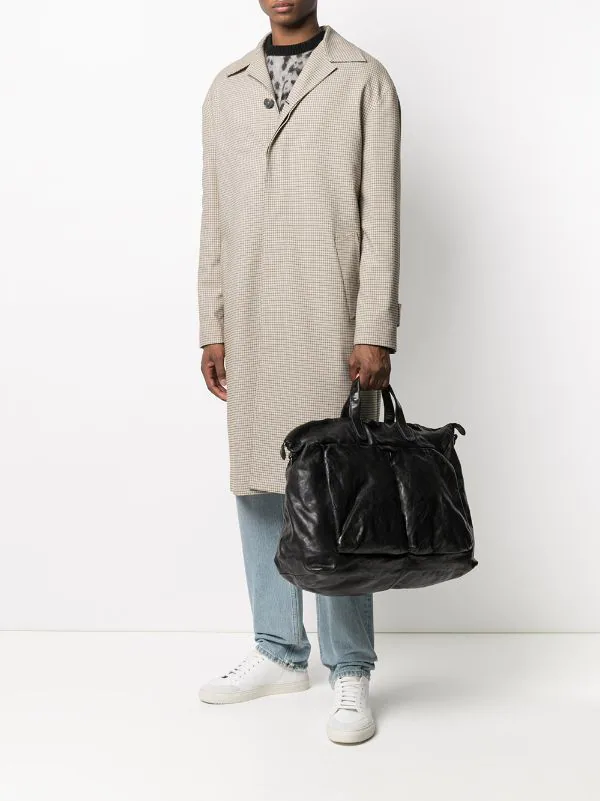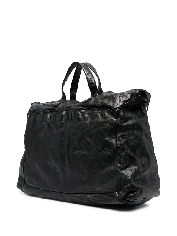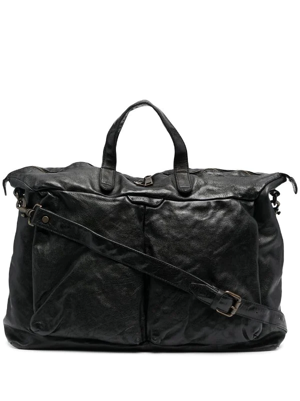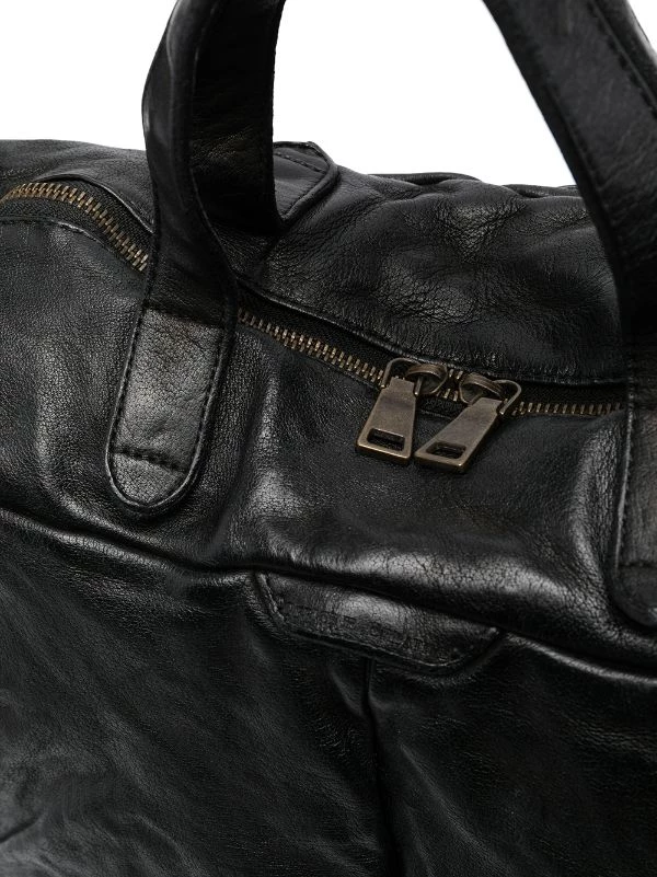 Anses sur le dessus, poches intérieures zippées, patch logo intérieur. Couleur : Noir. Matière : cuir de buffle.