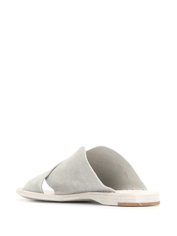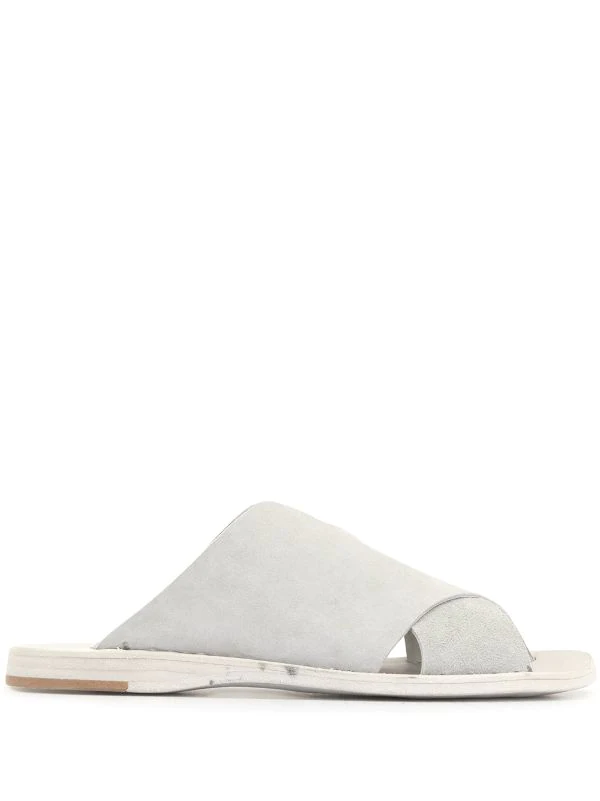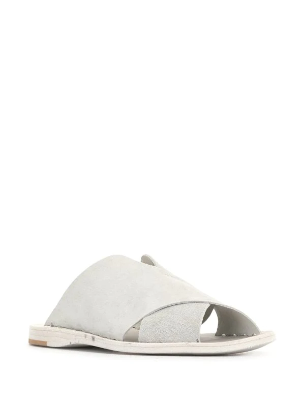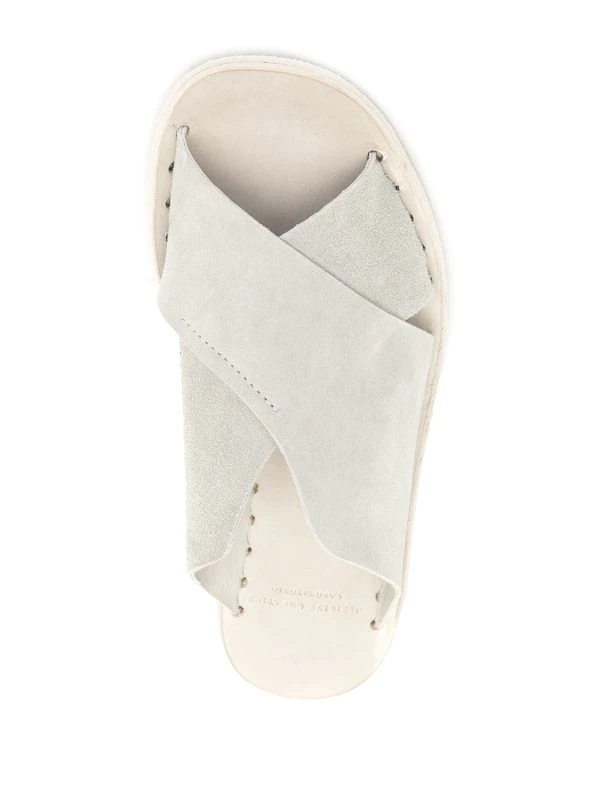 Semelle intérieure à logo, détail de brides croisées, bout ouvert, design à enfiler, semelle plate en cuir.